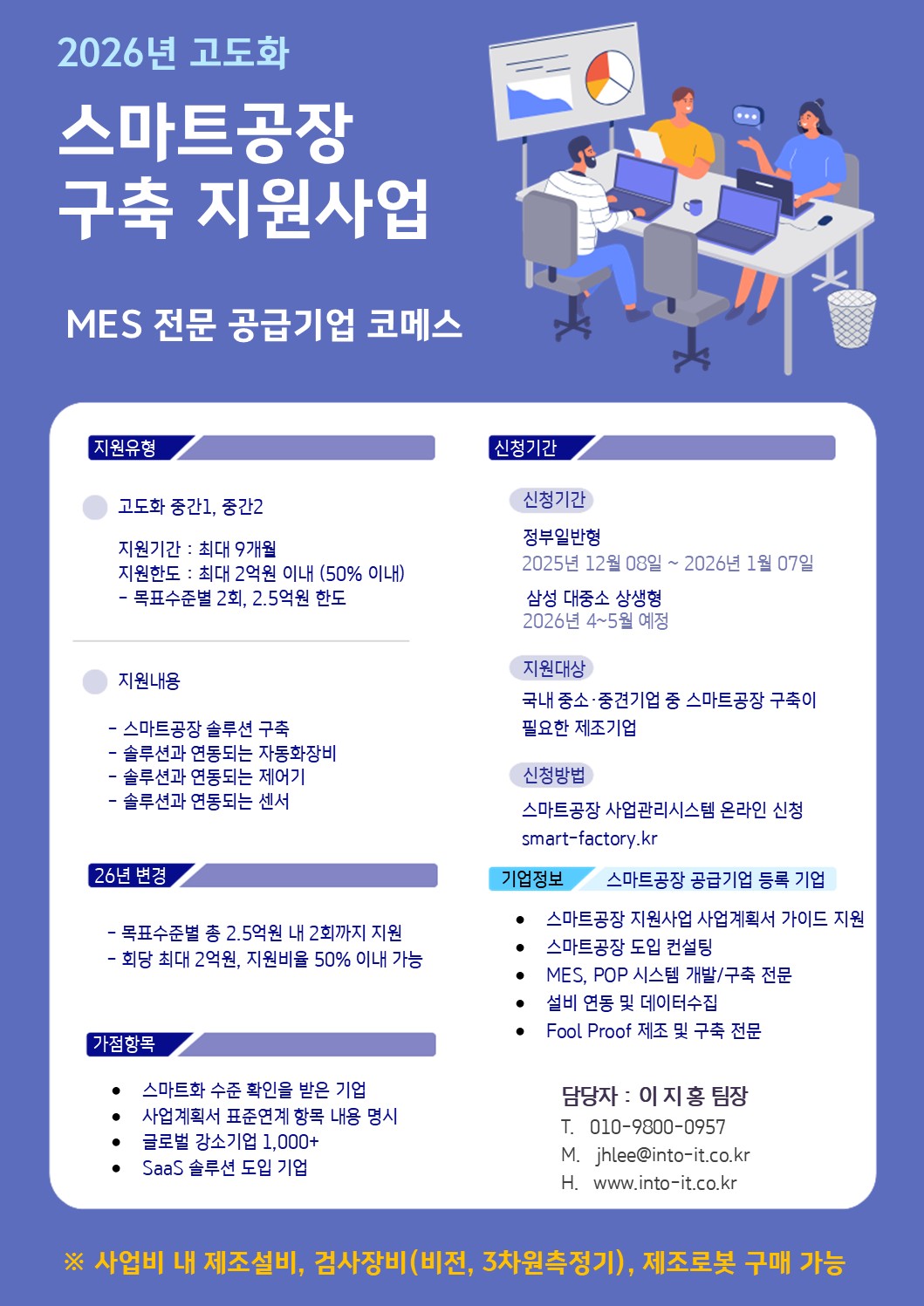 인투 NEWS 홈 인투정보 솔루션 지원사업 견적/방문상담 회사소개 인투정보 인투 NEWS 인투 NEWS 인투 NEWS ✨2026 스마트공장 구축 지원사업_고도화 작성자 이지홍 등록일 2025-11-13 조회수 165 첨부파일 코메스 MES 소개자료.pdf 목록