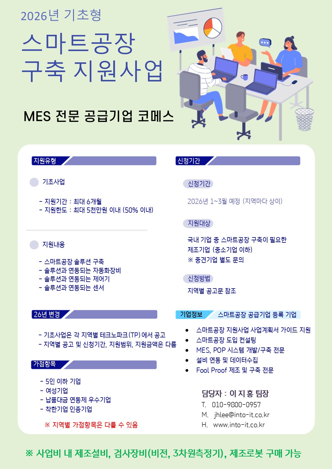 (주)인투솔루션즈 솔루션 지원사업 견적/방문상담 회사소개 인투정보 구매상담 1688-8967 도입문의 솔루션 기능별 회계/인사관리 제조/유통관리 비영리/공공기관 그룹웨어 보안 클라우드 제품별 아마란스10 모바일 물류관리시스템 옴니이솔(OmniEsol) MES 표준 MES 식품 MES 사출 / 성형 / 프레스 MES 위하고 그룹웨어 지원사업 2026 스마트공장 구축 지원사업 일생활균형 인프라 구축비 지원제도 견적/방문상담 회사소개 인투정보 인투NEWS TOP 닫기 빠른상담 제안서 회사명 담당자명 솔루션 선택 아마란스10 모바일 물류관리시스템 사출 / 성형 / 프레스 MES 식품 MES 표준 MES 2026 스마트공장 구축 지원사업 일생활균형 인프라 구축비 지원제도 MES 그룹웨어 옴니이솔(OmniEsol) 위하고 개인정보 수집항목 동의 자세히 > 마케팅 수신 동의 자세히 > 도입문의 1688-8967 회사명/담당자명 솔루션 선택 아마란스10 모바일 물류관리시스템 사출 / 성형 / 프레스 MES 식품 MES 표준 MES 2026 스마트공장 구축 지원사업 일생활균형 인프라 구축비 지원제도 MES 그룹웨어 옴니이솔(OmniEsol) 위하고 개인정보 수집항목 동의 자세히 > 도입문의 1688-8967 인투 NEWS 홈 인투정보 솔루션 지원사업 견적/방문상담 회사소개 인투정보 인투 NEWS 인투 NEWS 인투 NEWS ✨2026 스마트공장 구축 지원사업_기초형 작성자 이지홍 등록일 2025-12-30 조회수 45 첨부파일 코메스 MES 소개자료.pdf 목록